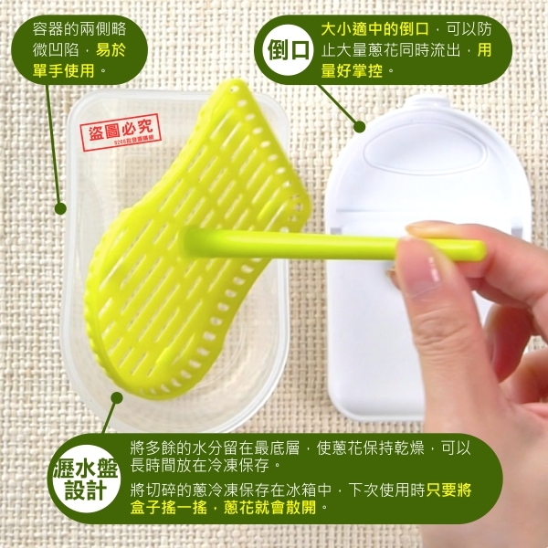✅ 瀝水盤設計,將多餘的水分留在最底層,使蔥花保持乾燥,可以長時間放在冷凍保存