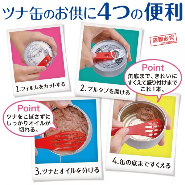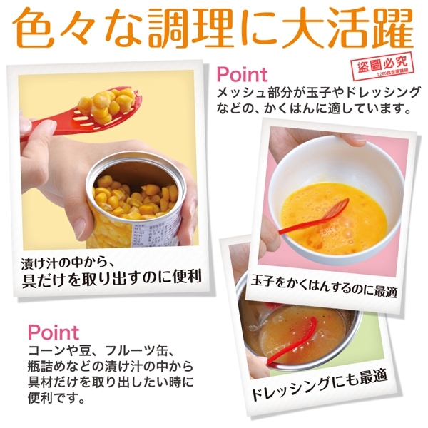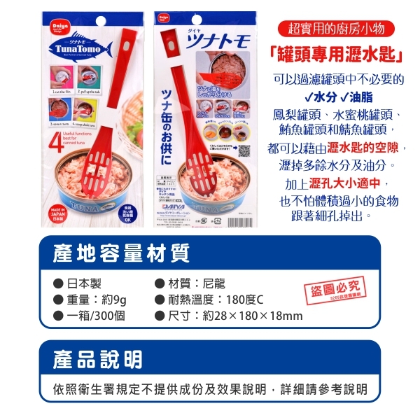 鳳梨罐頭、水蜜桃罐頭、鮪魚罐頭和鯖魚罐頭,都可以藉由瀝水匙的空隙,瀝掉多餘水分及油分