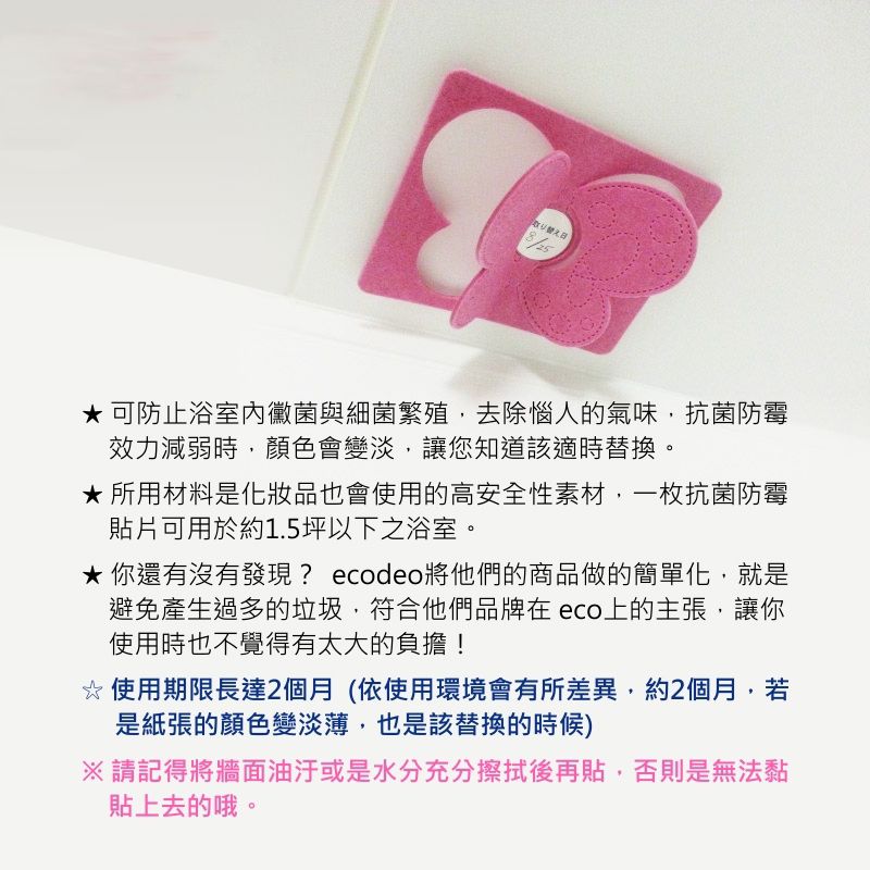 所用材料是化妝品也會使用的高安全性素材,一枚抗菌防霉貼片可用於約1.5坪以下之浴室。