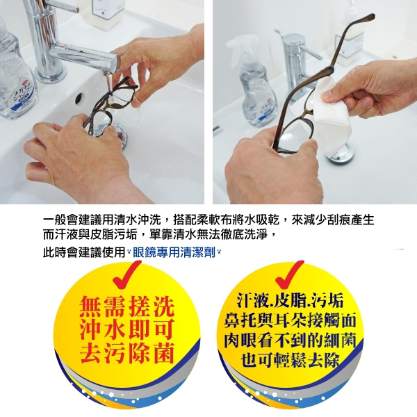 而汗液與皮脂污垢,單靠清水無法徹底洗淨,此時會建議使用⍣眼鏡專用清潔劑