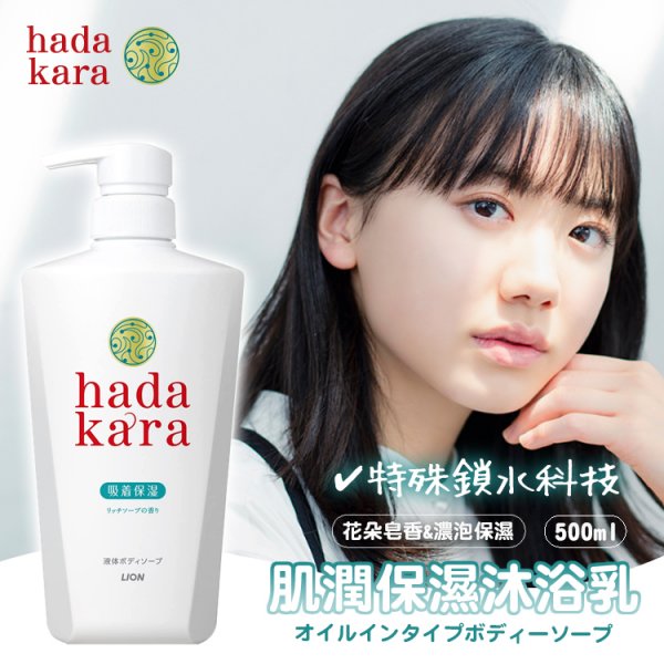 即將//【hada kara】肌潤保濕沐浴乳500ml-花朵皂香(綠)