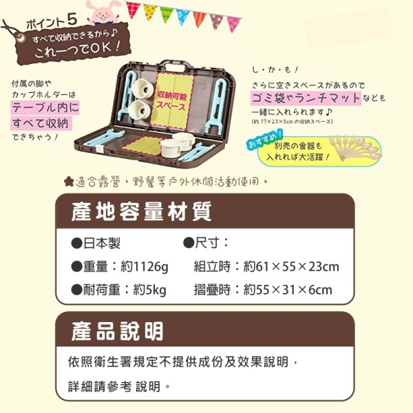 輕巧手提式摺疊桌,側邊可放置✓飲料、✓鉤掛提袋